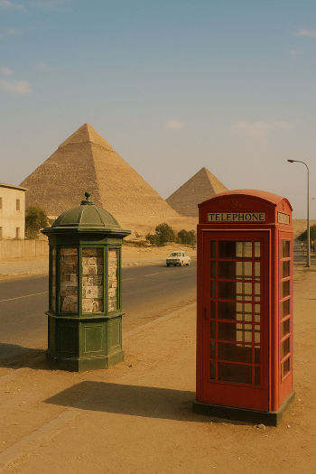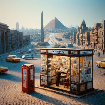 "Create a realistic Cairo view with the site of Gizeh in the background, a newspaper kiosk and a phone booth in the 1980s".