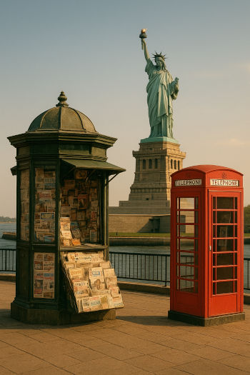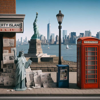 "Create a realistic Liberty Island view with the statue of Liberty in the background, a newspaper kiosk and a phone booth in the 1980s".