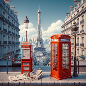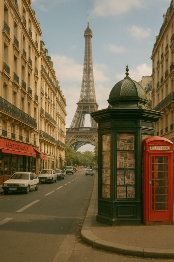 "Create a view of Paris with the Eiffel Tower in the background, a newspaper kiosk and a phone booth in the 1980s".