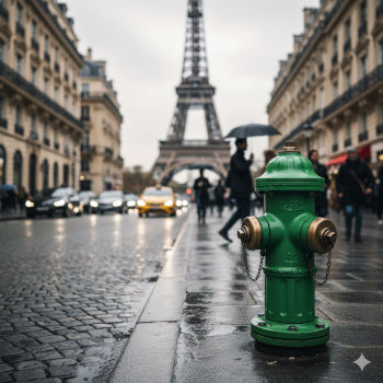 “Create a realistic Paris view with the Eiffel Tower in the background, a newspaper kiosk and a phone booth in the 1980s”.
