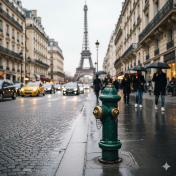 "Crée moi une vue de Paris avec la tour eiffel en fond, une avenue typique, un kiosque à journaux et une cabine téléphonique dans les années 1980"